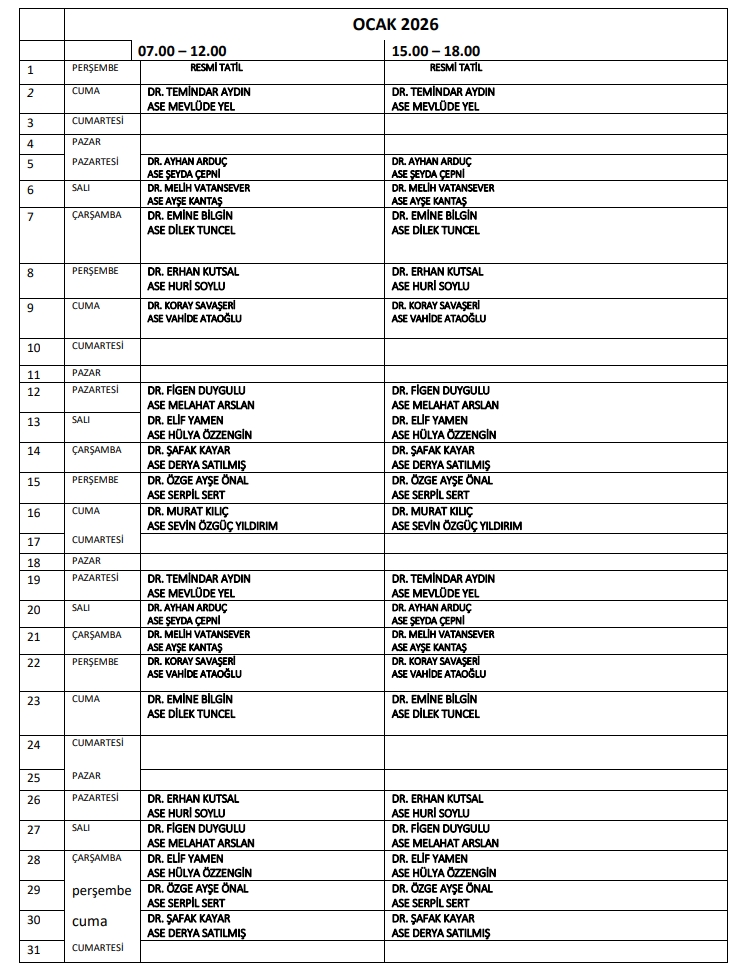 Hekimlerimizin Çalışma Saatleri İçin